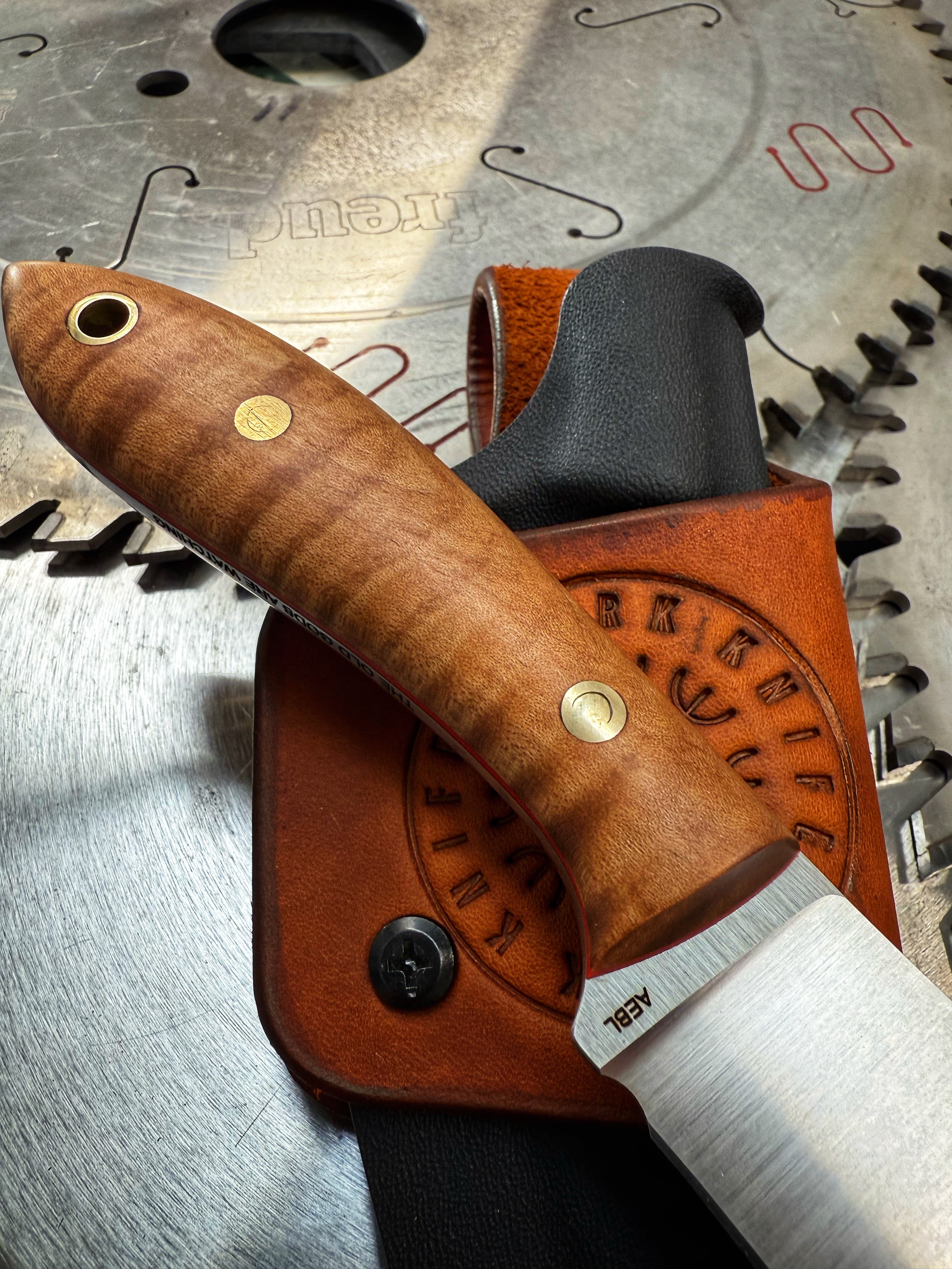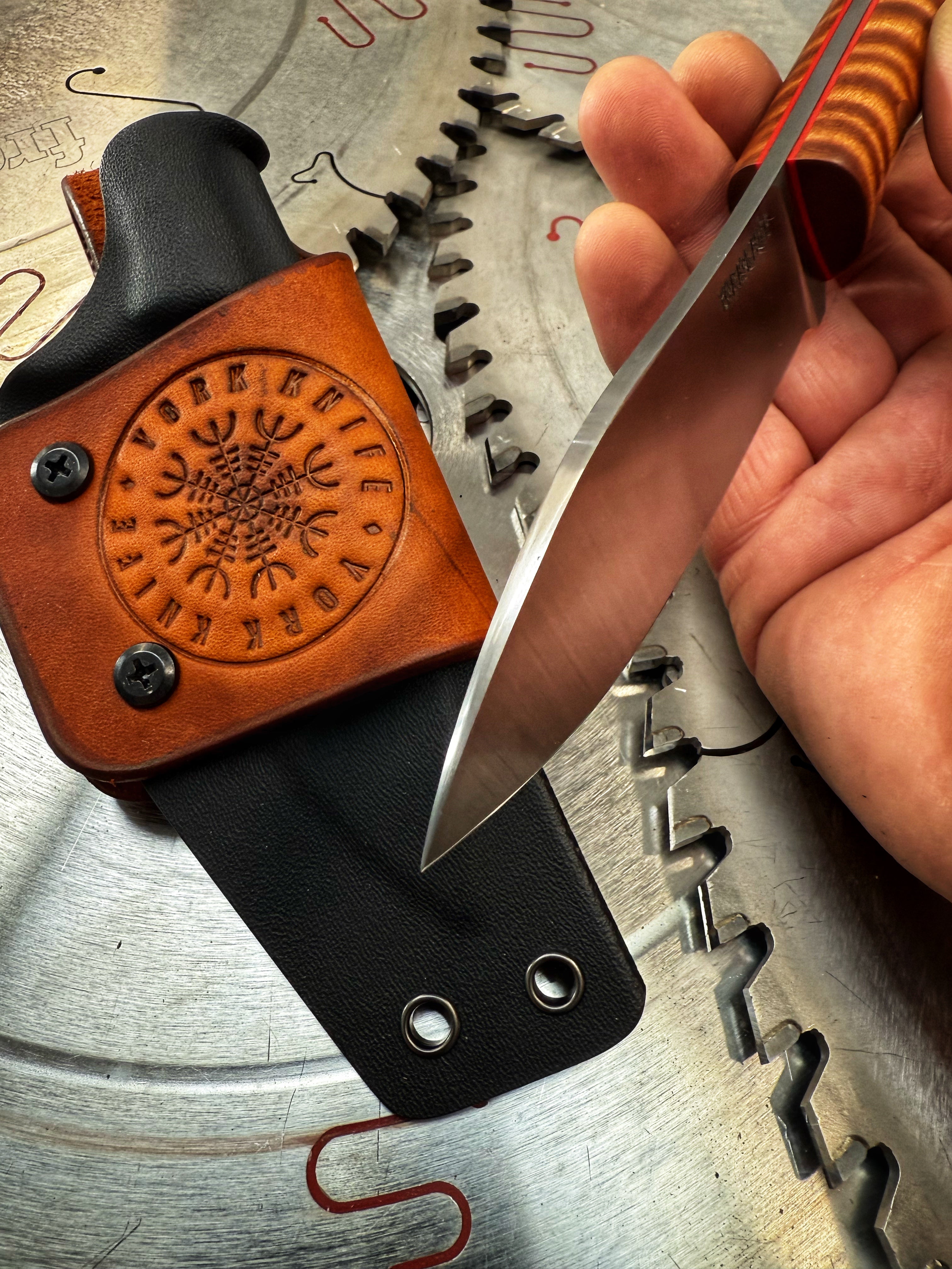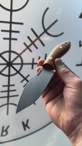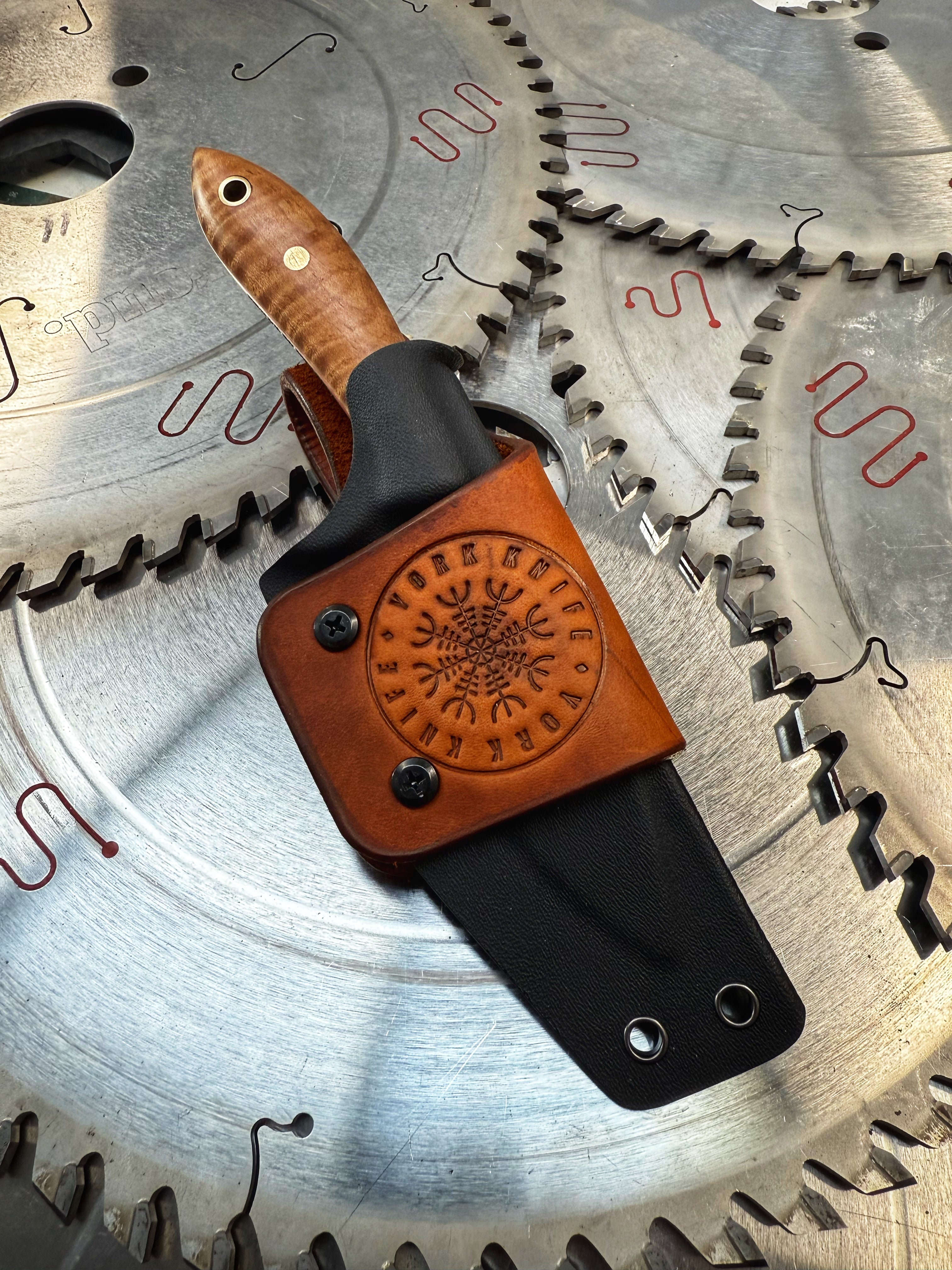 This knife has a lot going for it, AEBL stainless steel for toughness, edge retention and patina resistance, stabilised Rippled Maple from Canada with its beautiful appearance, handmade hybrid kydex and leather sheath with beautifully embossed Norse iconography to create stand out tool.