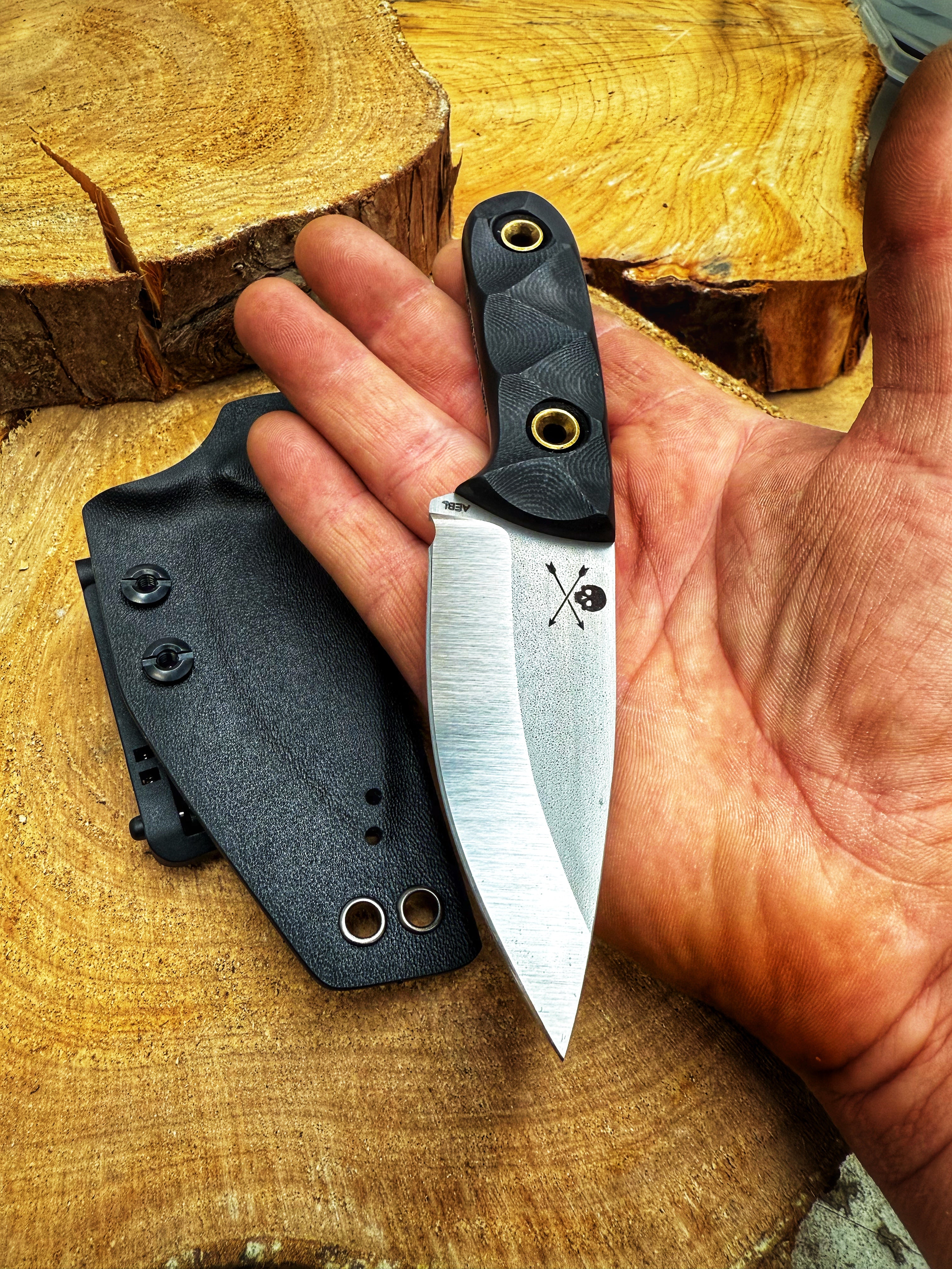 The sabre grind with convexed secondary bevel makes this one nice and slicy, great for small projects around the campfire and food prep, we've even had people process small game like rabbits with these, all in all a really versitile knife. We’ve rounded over the front of the spine slightly for comfort and to aid in game prep, if you know you know, don’t worry though as the part you’d use to scrape a ferro rod to start a fire is still a sharp 90 degrees so you’ll have no problems throwing sparks .