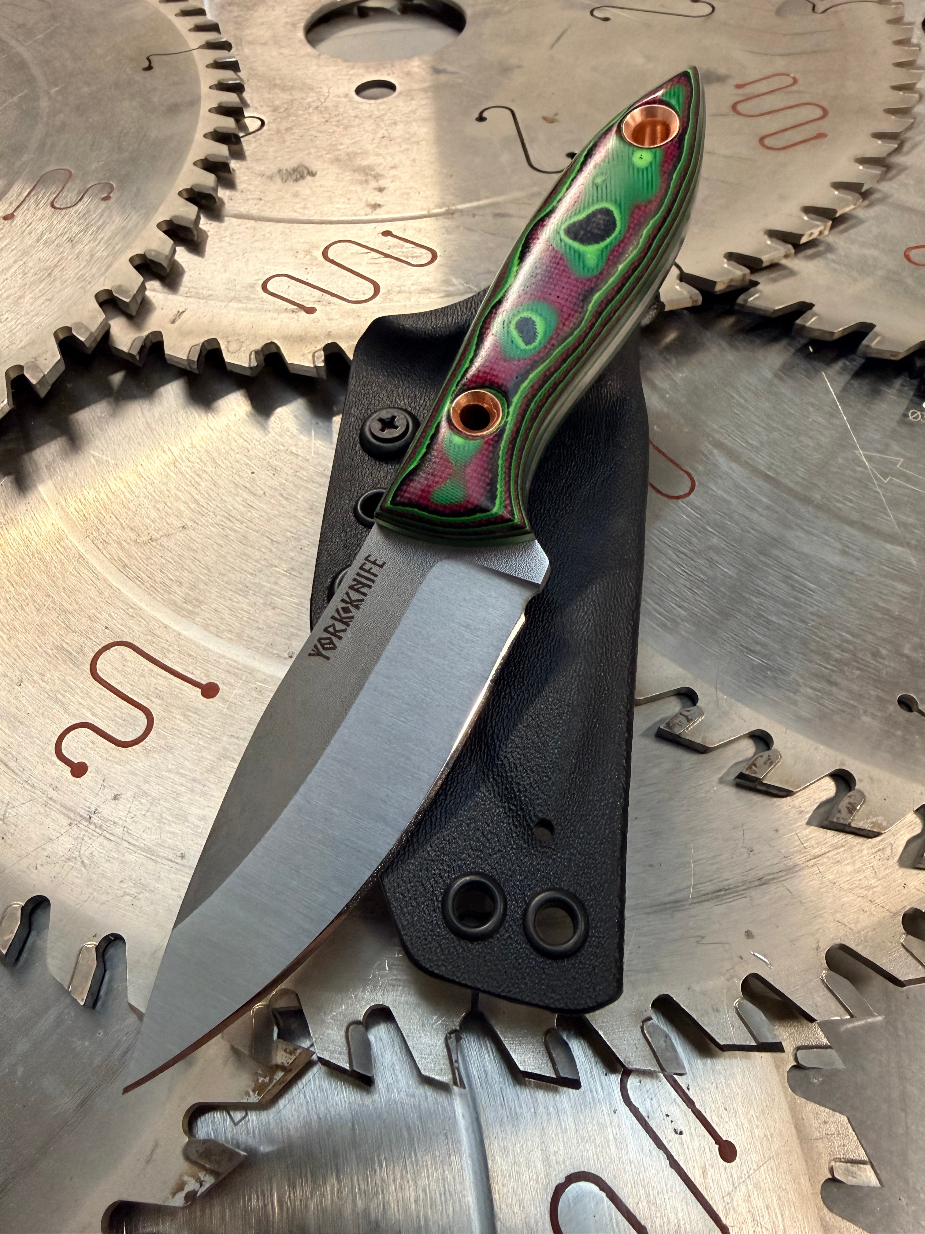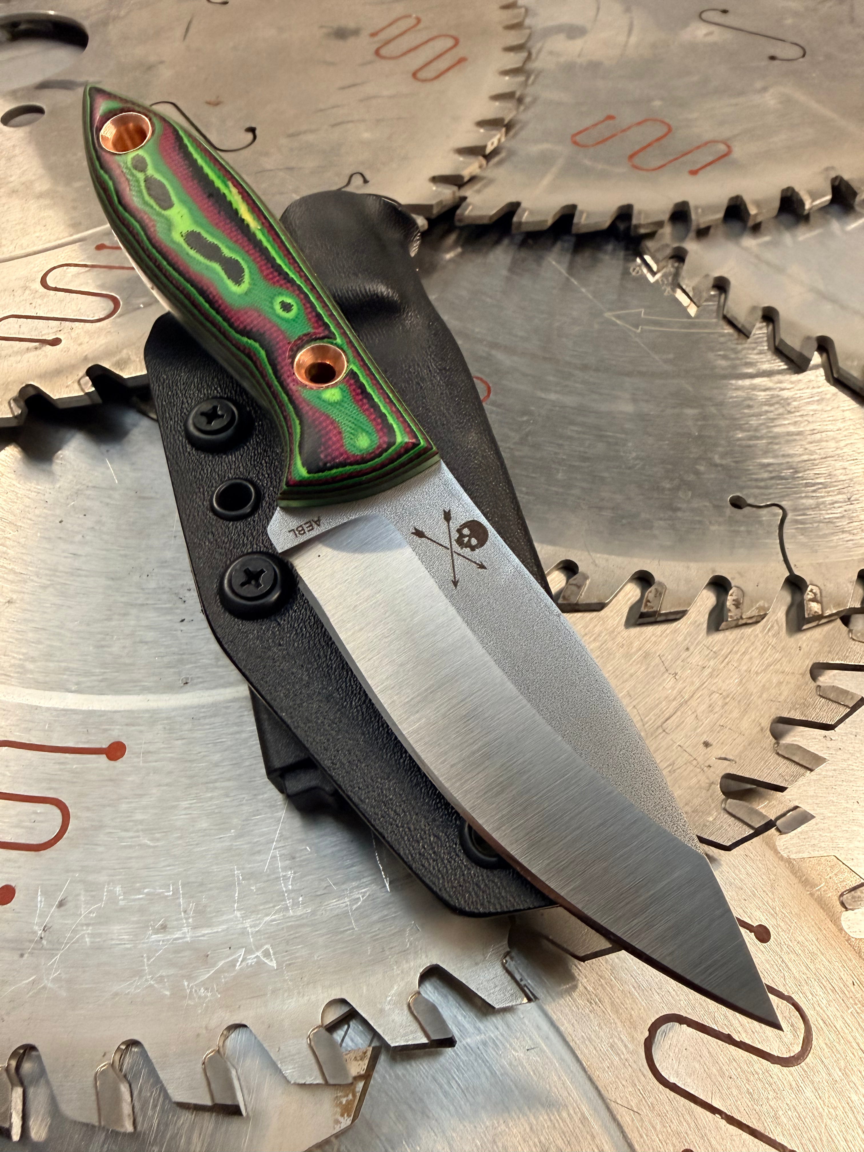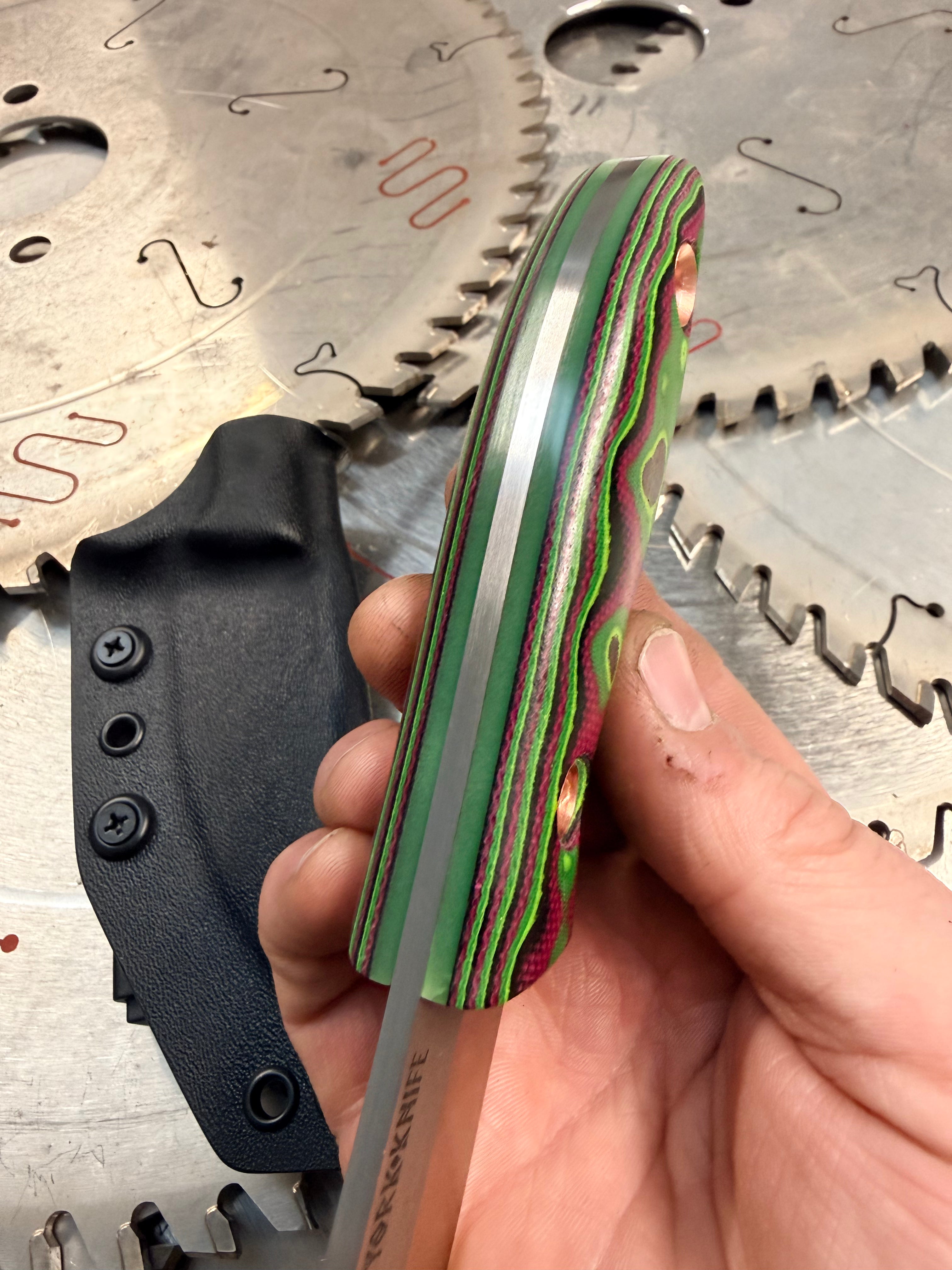 A slicey 3.5” sabre grind with a nice belly upfront and a hand finished secondary bevel in the well regarded AEBL stainless steel. The steel originally designed for razor blades is tempered to 59 Rockwell hardness so holds an edge well, while ensuring this one isn't as hard to sharpen like some of the more exotic stainless steels. This steel also has a great reputation for being very corrosion resistant, a massive plus for a knife designed to be a user in the field.