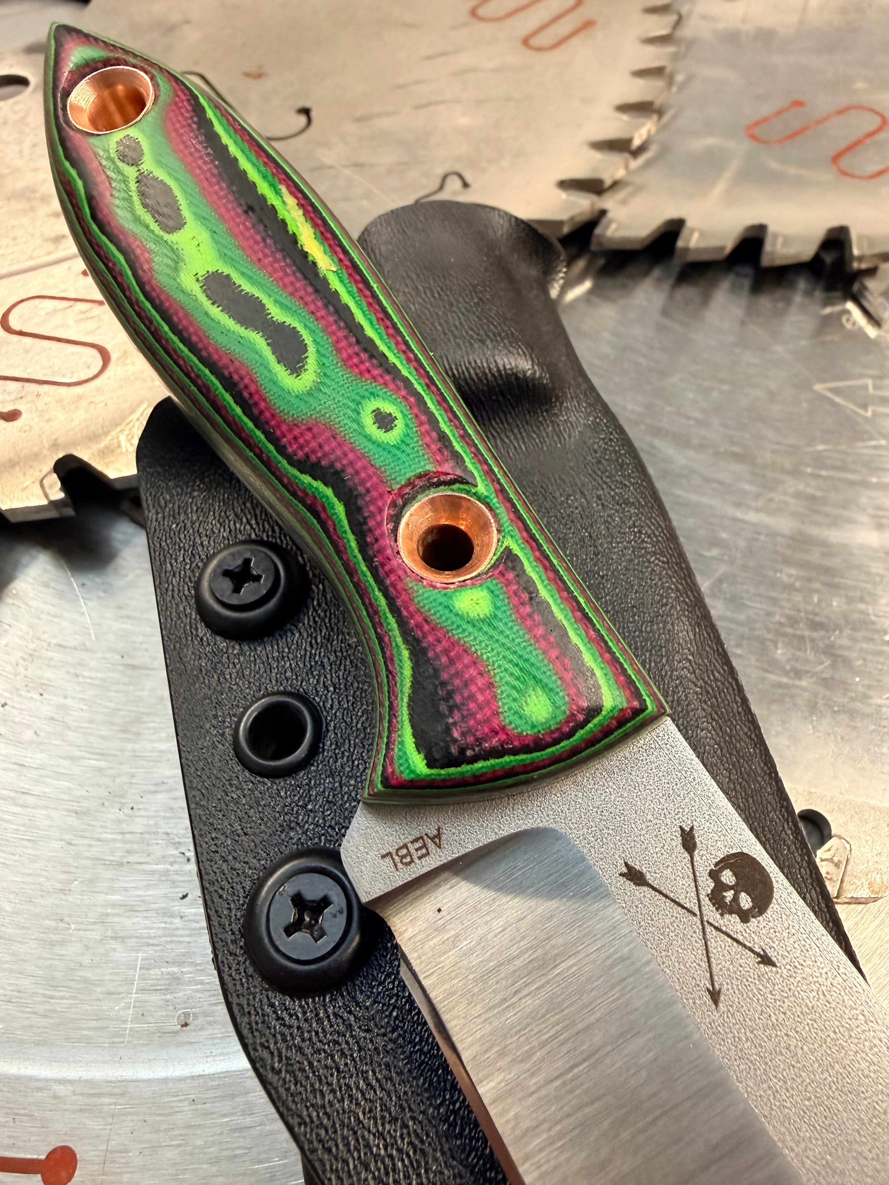 We’ve designed the tang to be neutral in the hand and the scales are held on mechanically with copper flared tubes and chemically fixed with marine grade epoxy making for an unshakable connection.