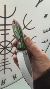 our striking use of the Toxic pattern Micarta is further enhanced by the glow in the dark liners we’ve laminated them too, check out the video in the pics section. You’ll never lose this knife on the forest floor or in the dark, to get the best from the GITD liners it’s best to charge them with a bright torch before your adventure.