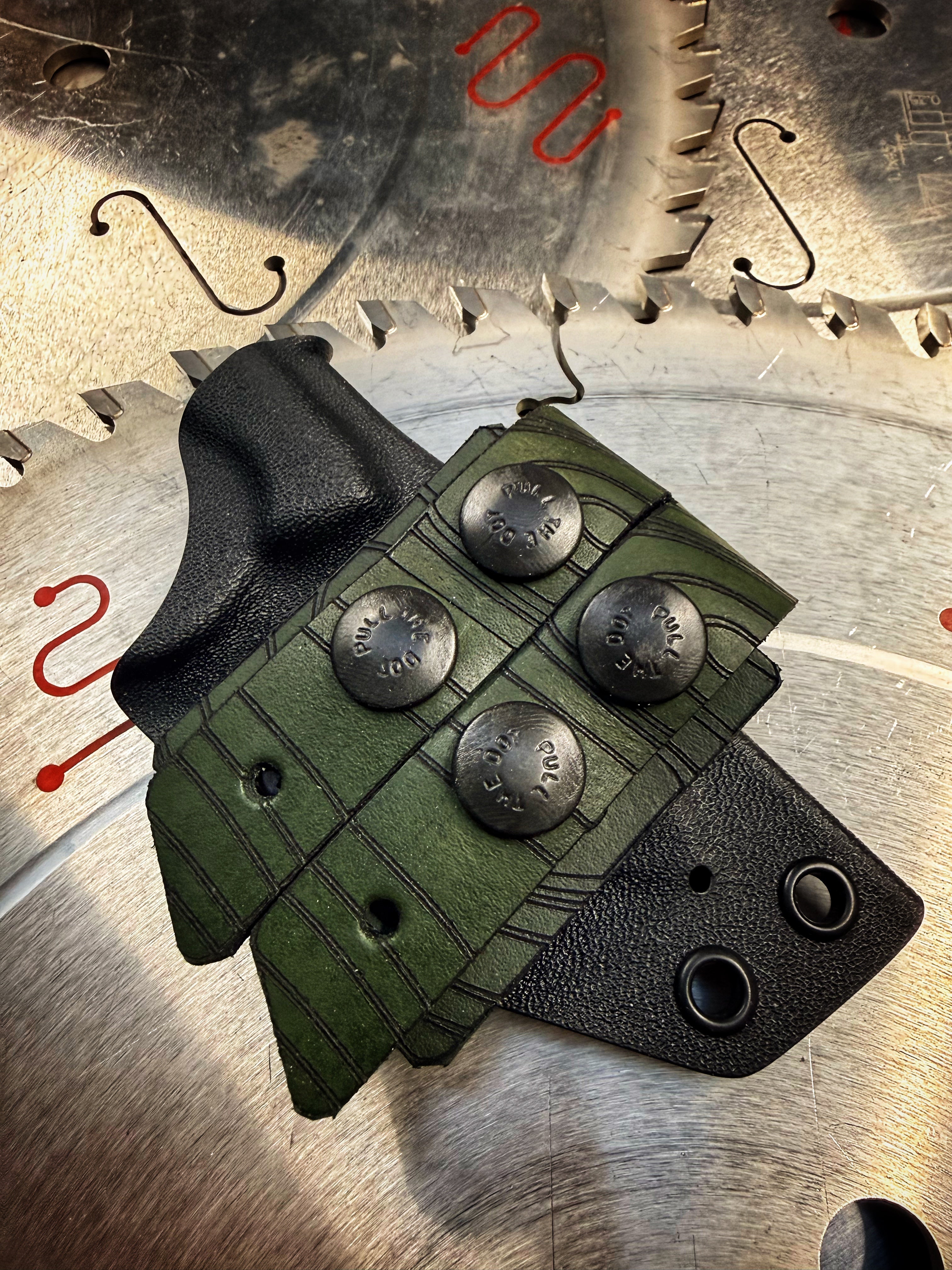 The kydex sheath offers a secure fit and the topographic laser branded leather scout carry harness gives a ruggedness to the package that a normal belt clip can’t attain (although we do provide a standard belt clip in the box for those that prefer that setup) we’ve souped the harness up by also using”pull the dot” fasteners meaning the poppers can only open by pulling in one direction so it’s less likely to open in the bush on branches and the like.