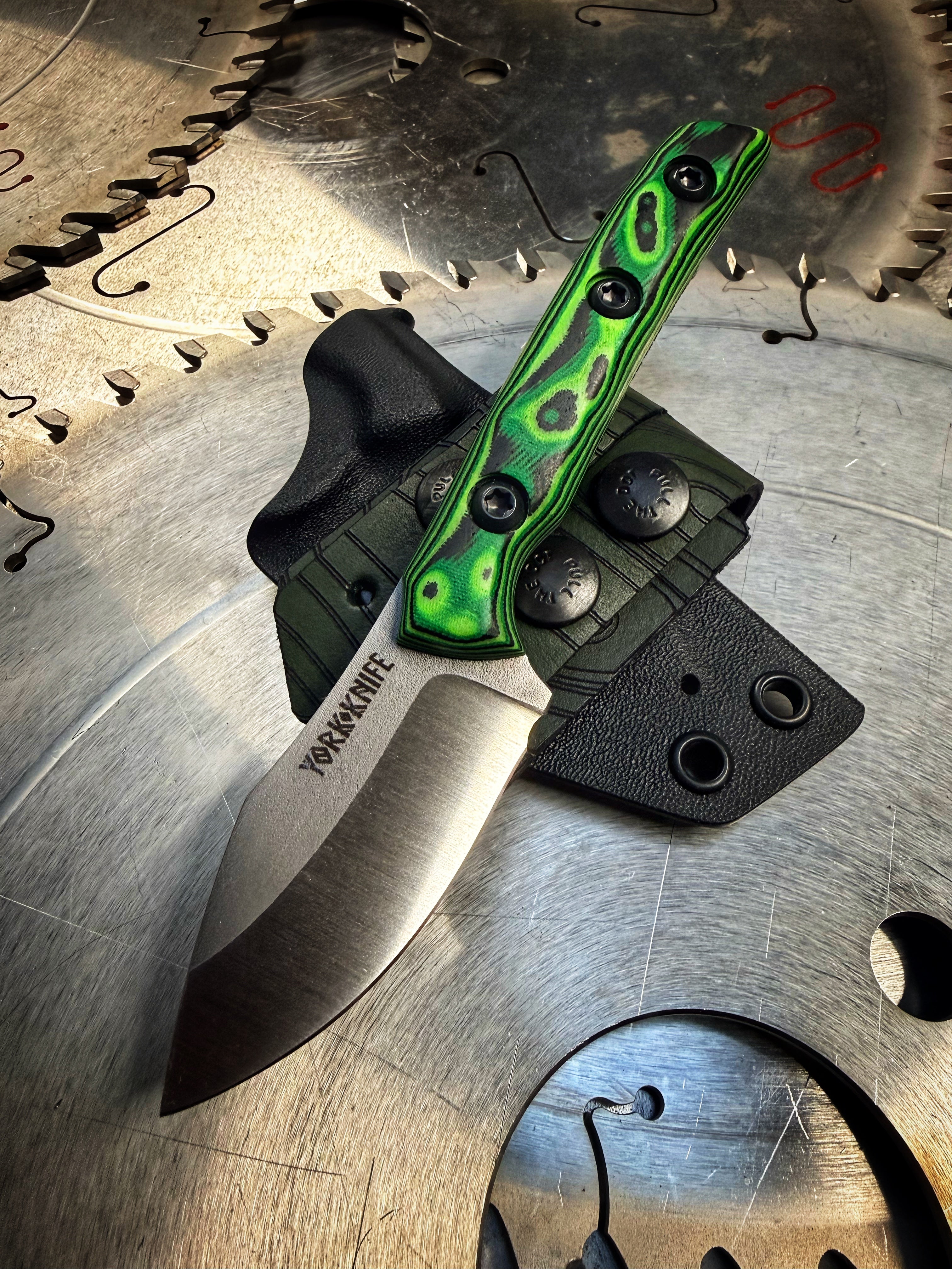 A really interesting piece of Toxic coloured Micarta pattern out back and a slicey sabre grind upfront, coupled to a convexed edge. Steel choice is the well regarded AEBL stainless steel which ensures this one is easy to sharpen away from base and very corrosion resistant.