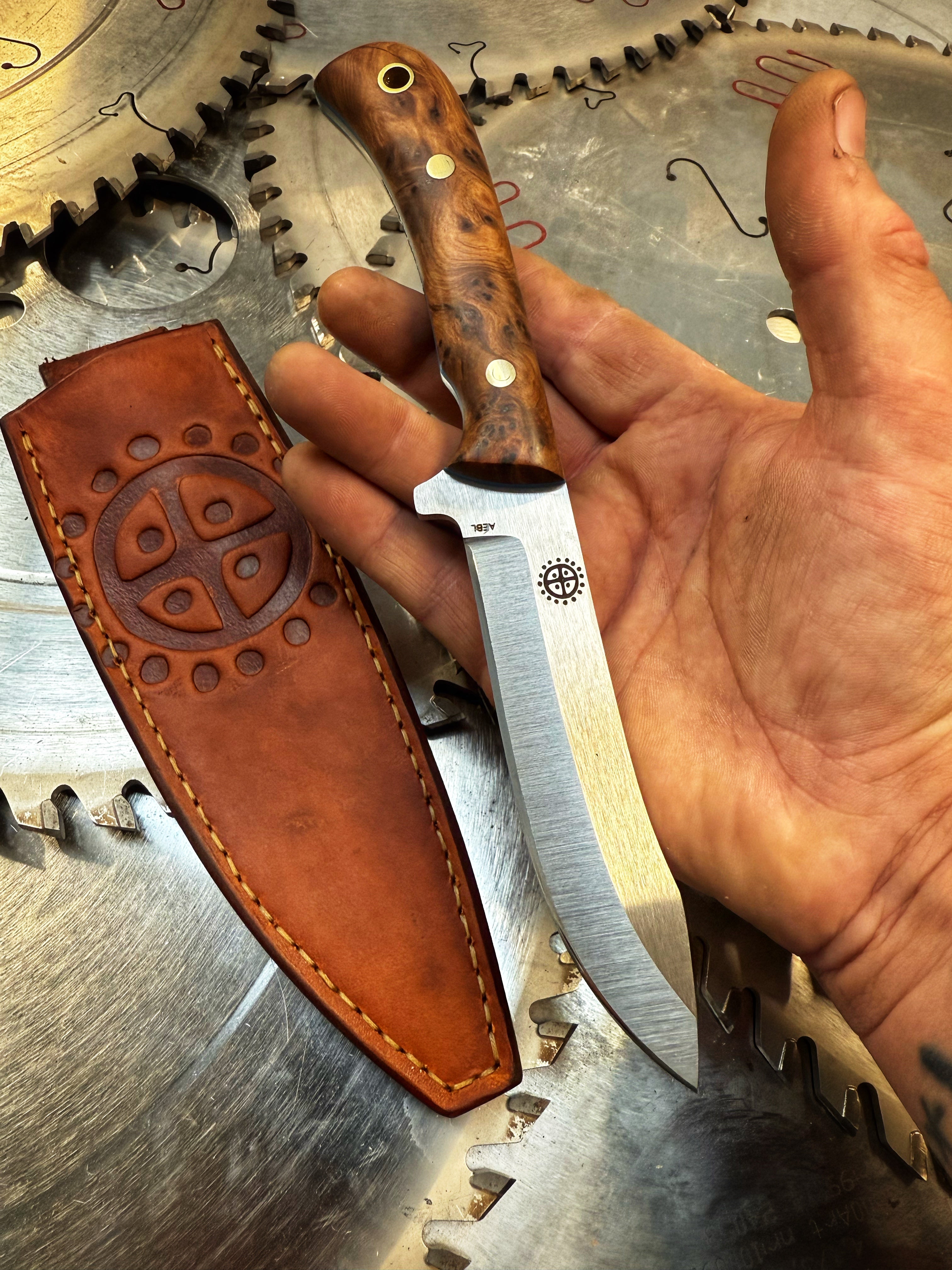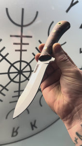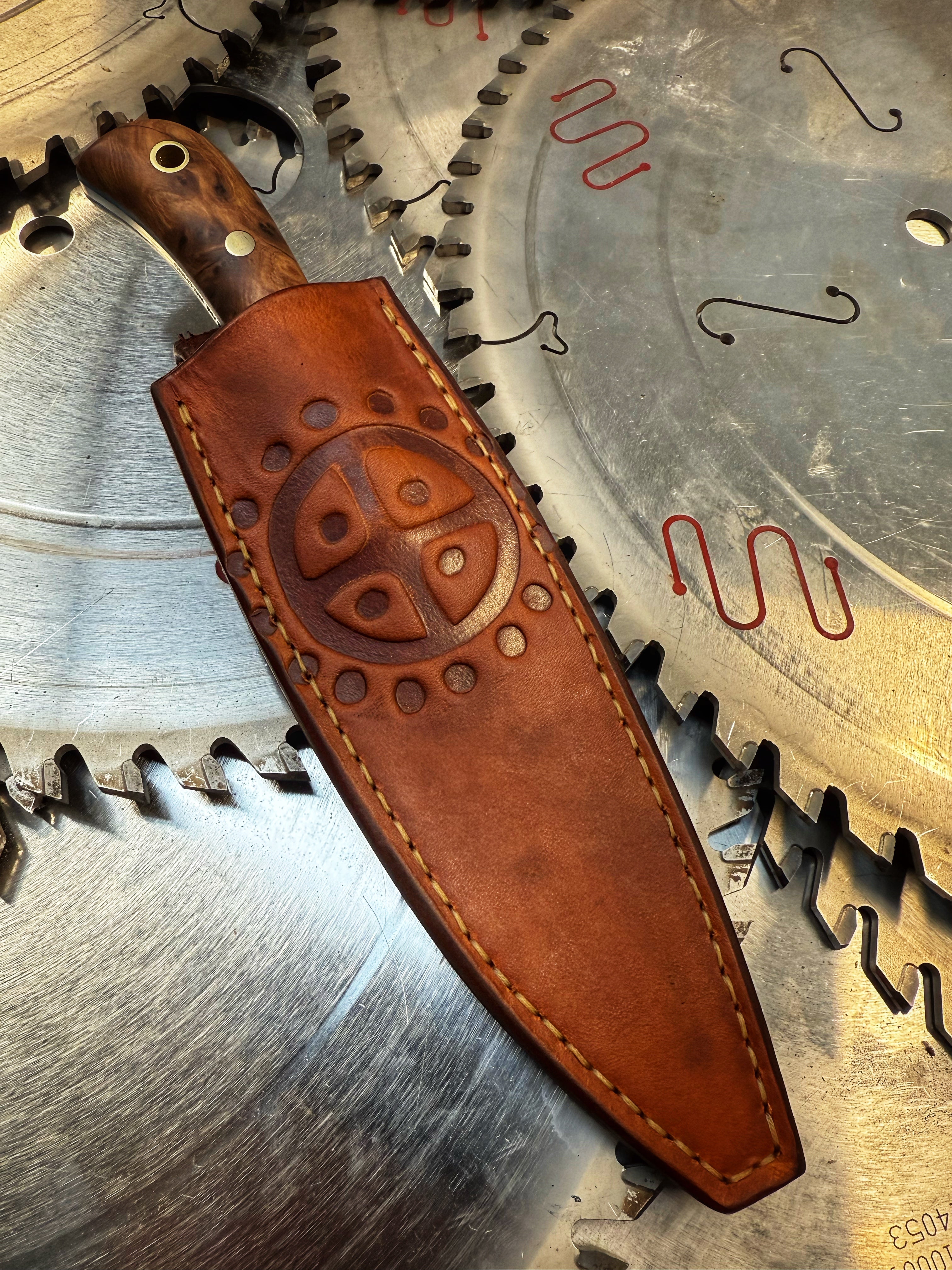 Weve fitted this Huntsman with a hardwearing piece of stabilised Thuya Burr and added vibrant blue G10 liners, held on with brass loveless bolts and of course marine grade epoxy. To complete the package we've created a right handed leather sheath that offers positive firm fit to ensure the knife won't leave its sheath as you're dragging yourself through the woodlands and embossed it with the Nordic sun motif, a symbol that’s been used for over a millennia to symbolise the sun and the seasons.