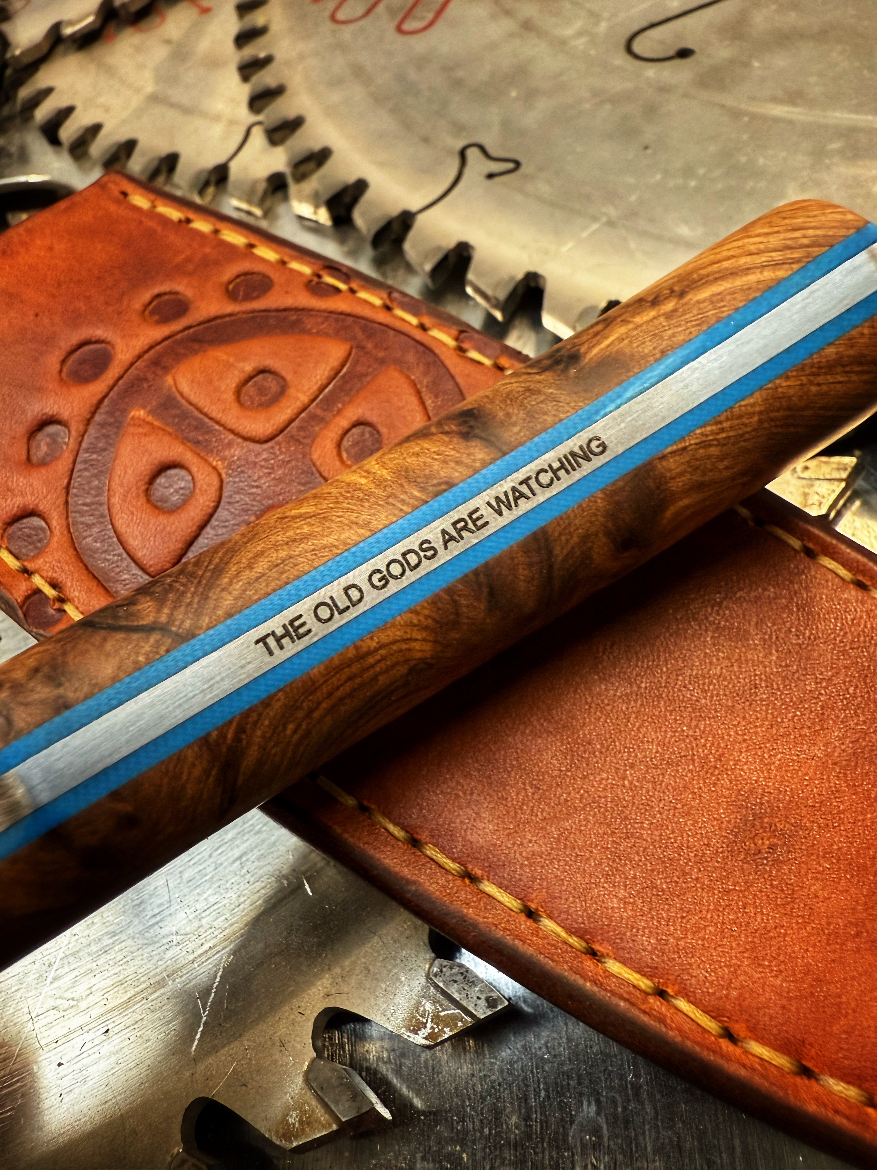 We've laser tattooed a bit Norse soul on to this by engraving “The old Gods are watching” on the underside of the spine, and the Nordic Sun image on the knife face and embossed the leather for a truly beautiful piece.