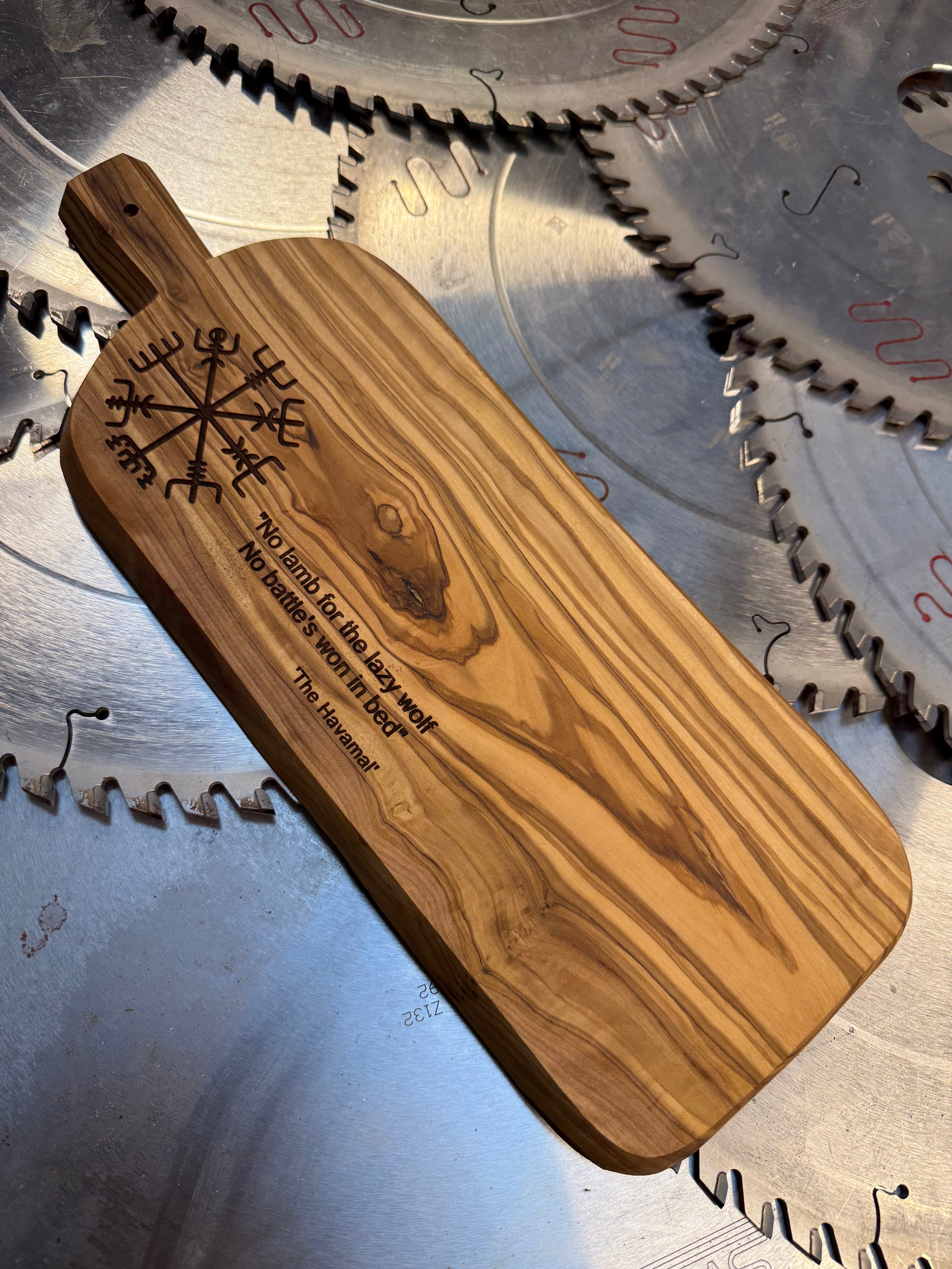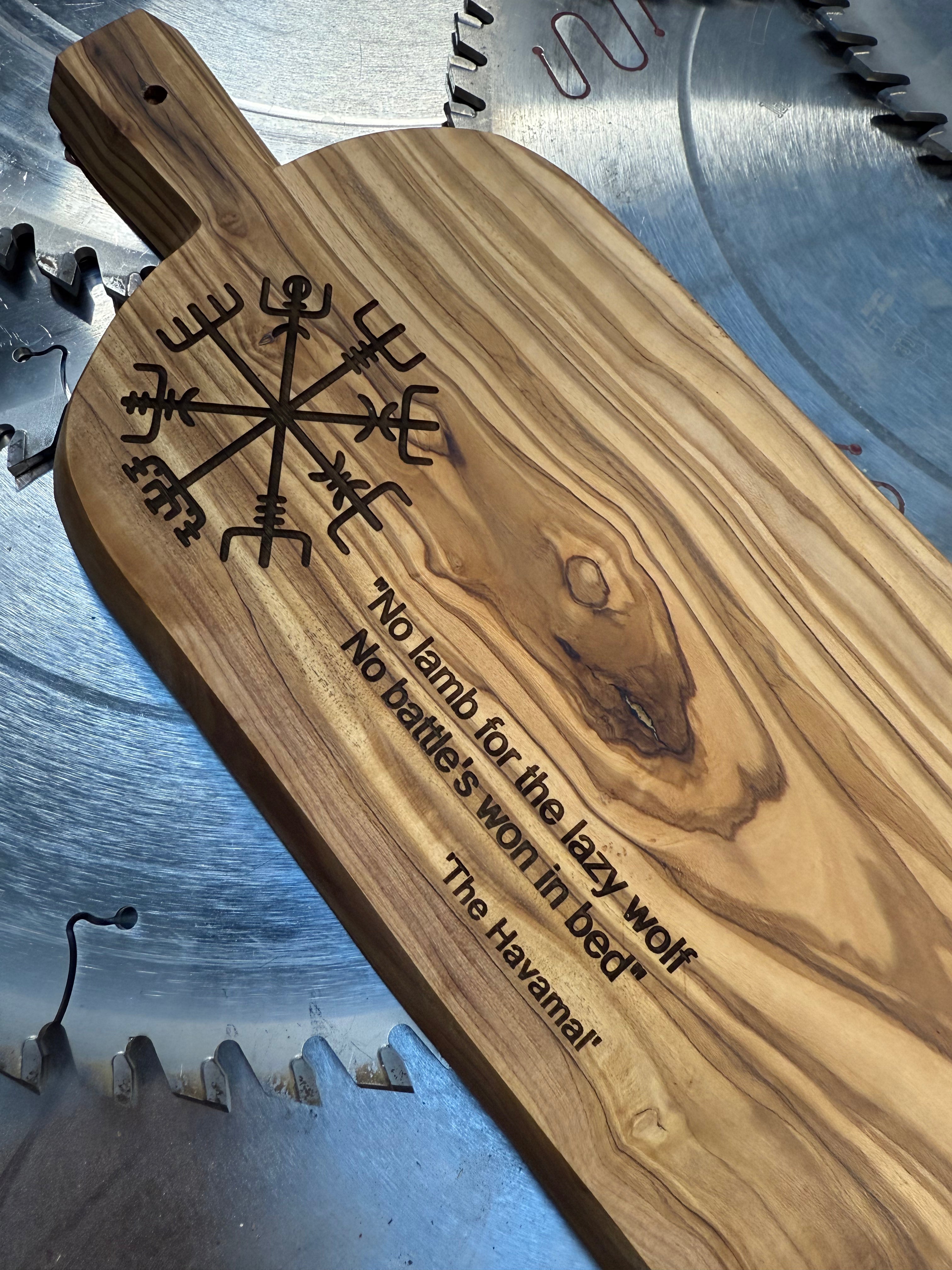 A beautiful figured Olive Wood board with our Norse inspired laser tattoos, an interesting and practical piece to have in the kitchen, take photos of burgers in the woods on wild camps for instagram or as a gift to a loved one.