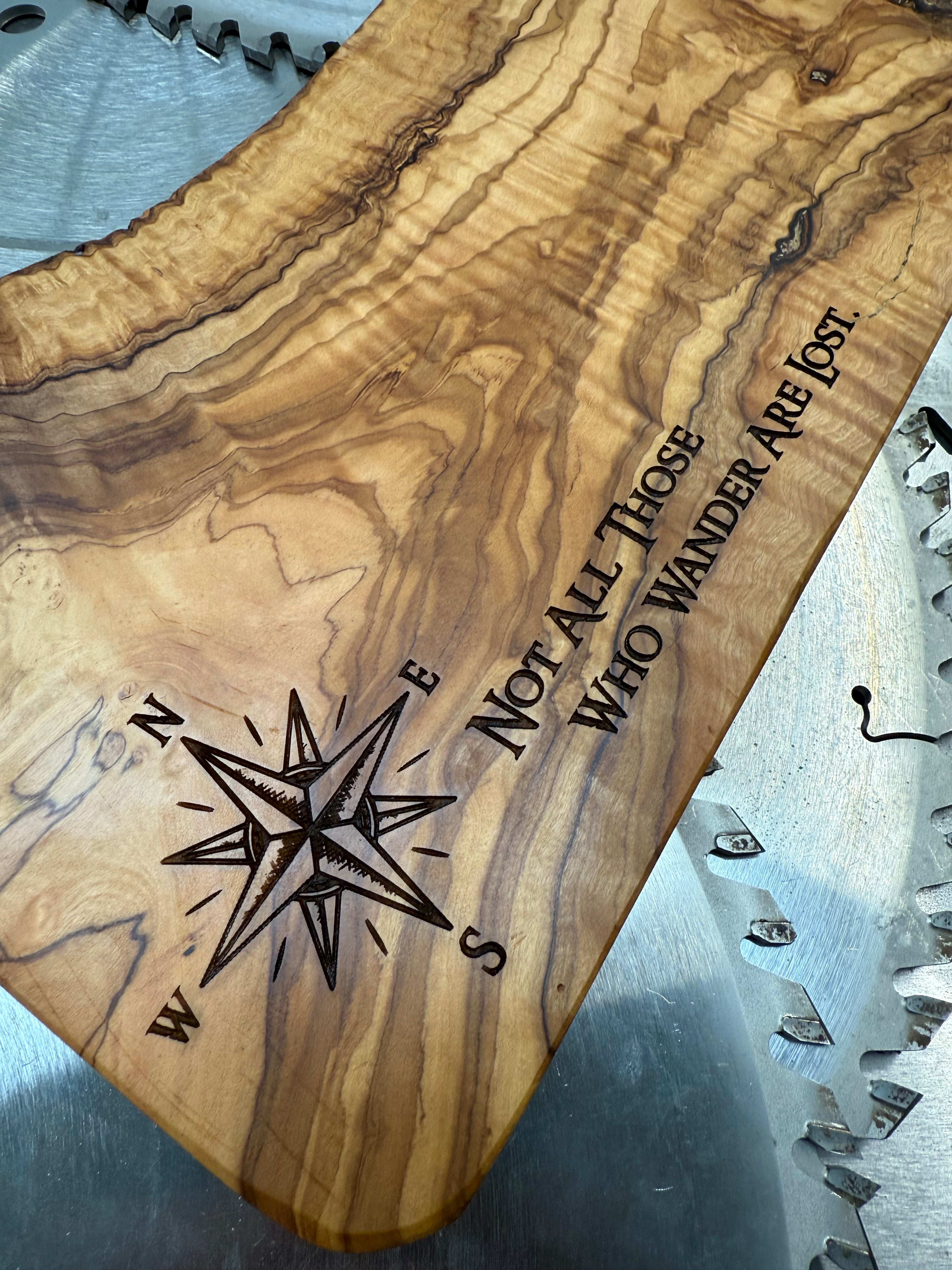 A beautiful figured Olive Wood board with our Norse inspired laser tattoos, an interesting and practical piece to have in the kitchen, take photos of burgers in the woods on wild camps for instagram or as a gift to a loved one.
