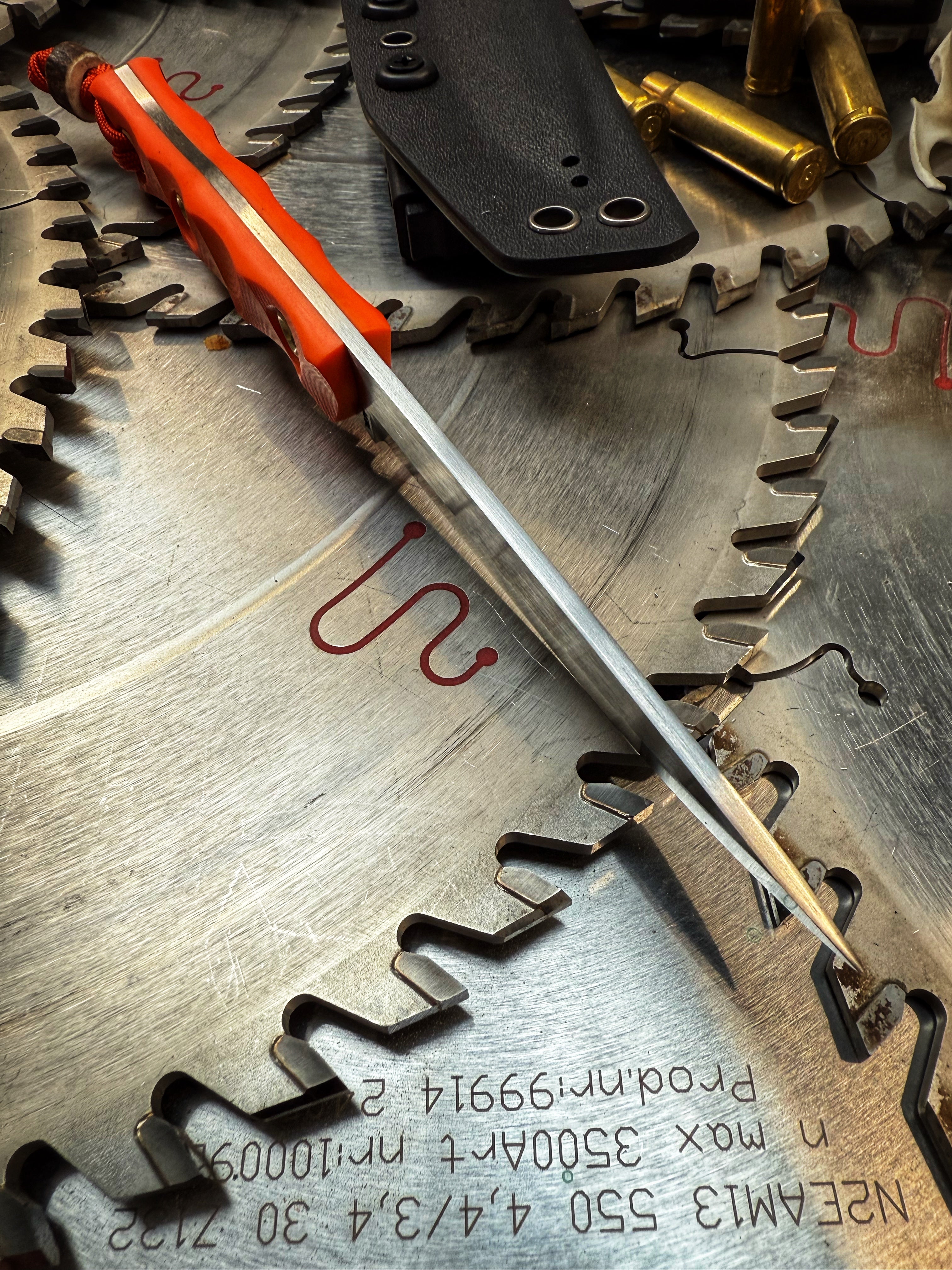 The cutting edge is a fraction over 4". The grippy Micarta handle has flared copper tubes to hold the scales to the tang, making cleaning a doddle. The kydex sheath offers a secure fit and the belt clip can be reversed for left or right hand carry.