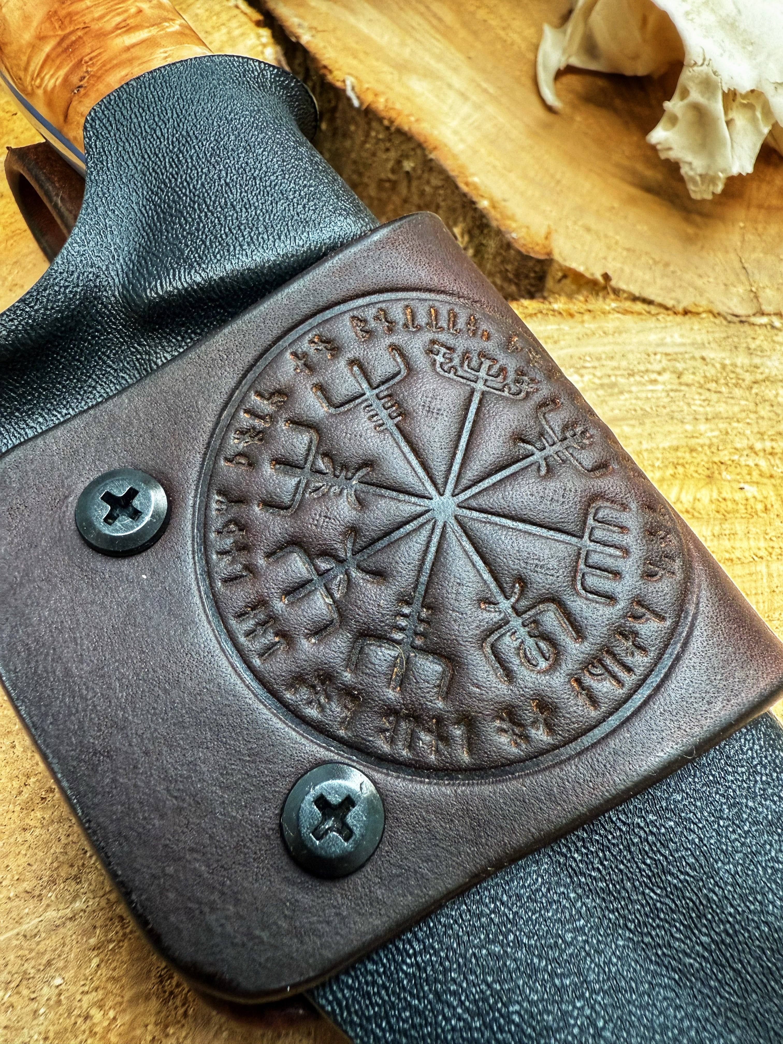 We’ve added some Norse character to this one by laser tattooing a “Wayfinder” sigel to the blade face. We’ve added our signature sheath style to this package and dressed the Huldra in kydex and leather, then embossed the hand finished leather wrap with a matching “Wayfinder” sigel, making a beautiful heirloom piece that you can be proud of.