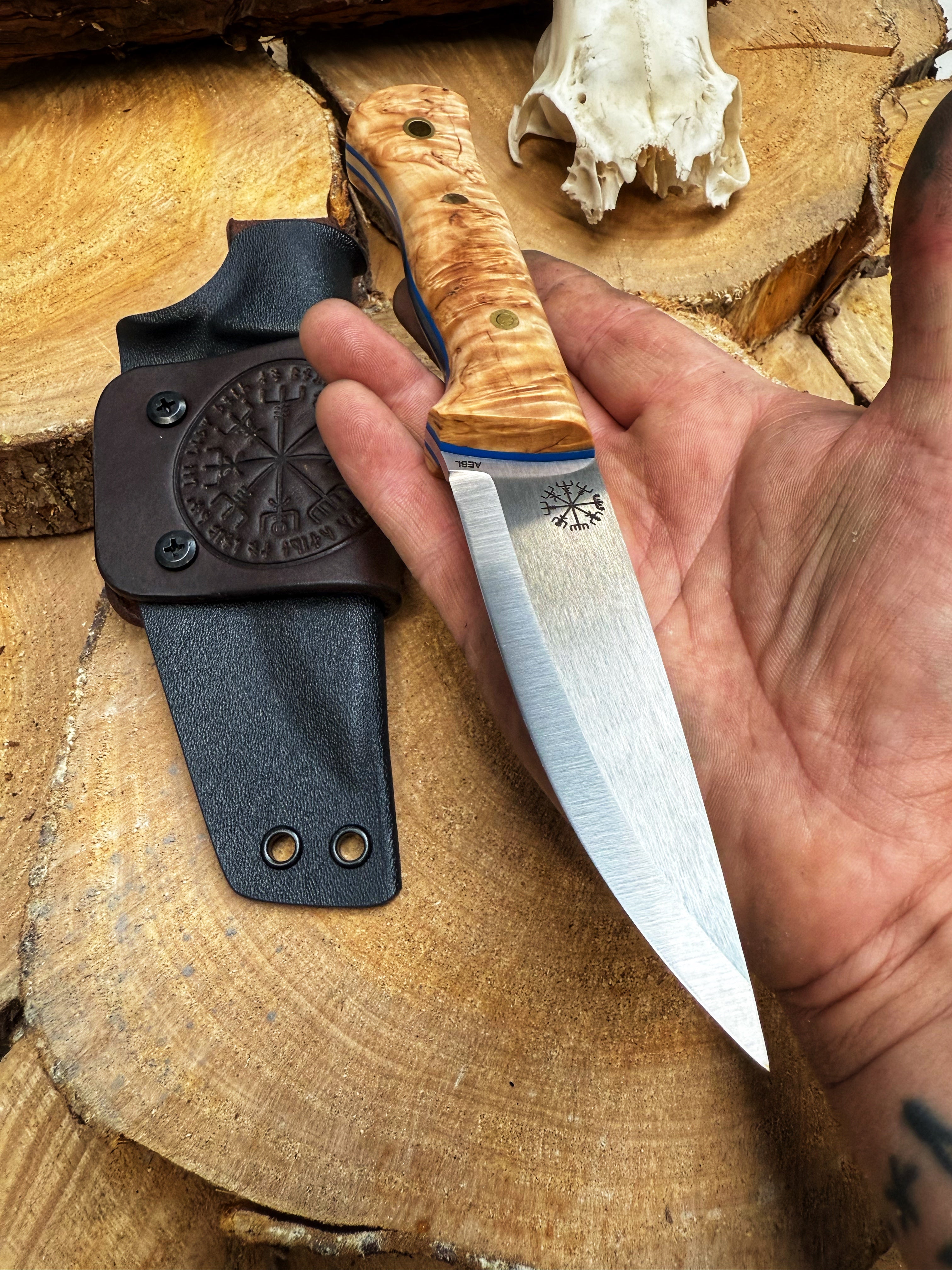 Our Huldra is a full size bushcraft knife that ticks all the boxes, 3.5mm AEBL stainless steel, hand made kydex and leather hybrid sheath along with a lovely piece of heavily figured stabilised Masur Birch for the handle.