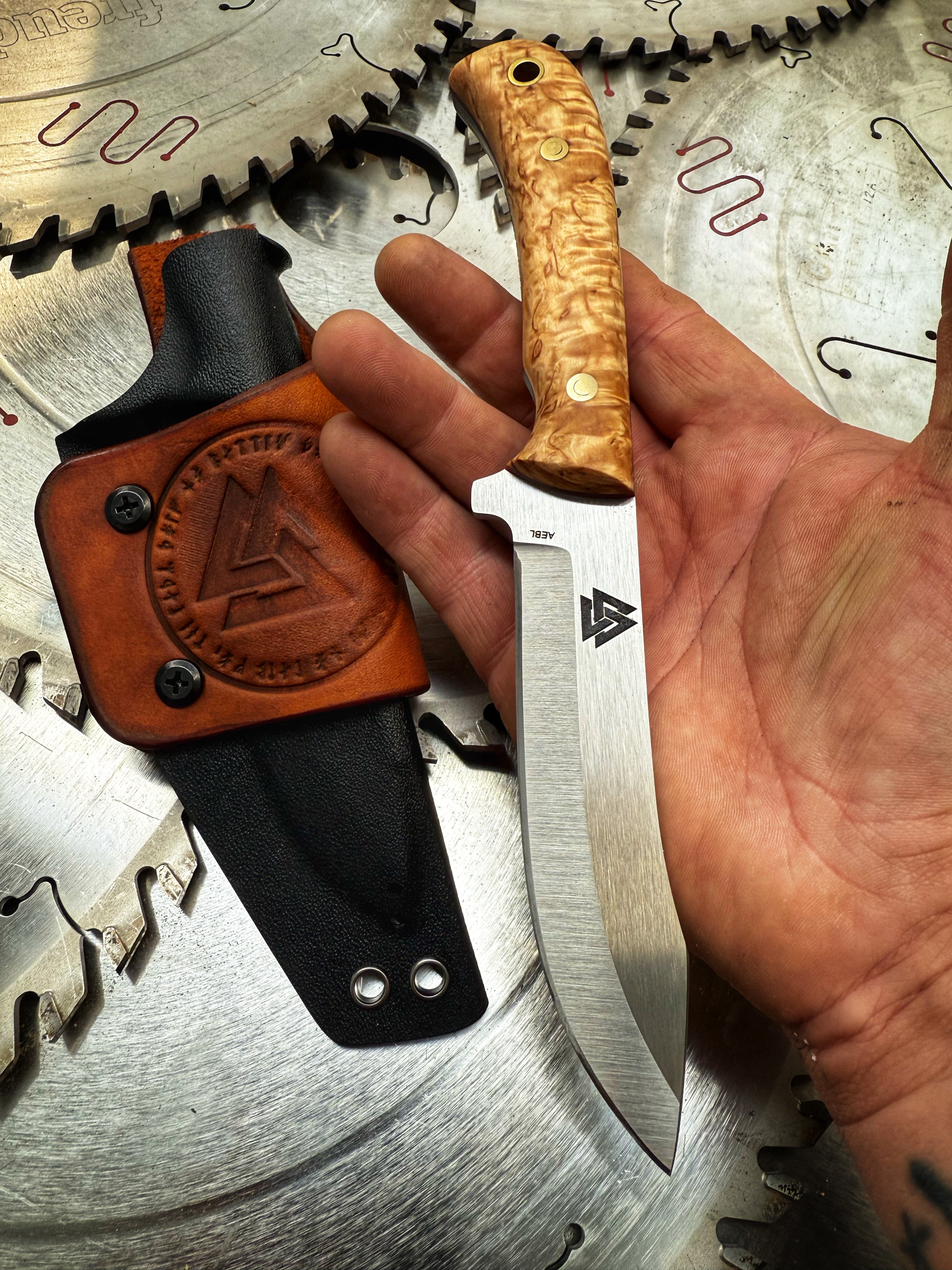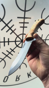 We've laser tattooed the Norse Valknut symbol on the knife face abe a verse from the Viking book the “Havamal” and to tie it all together we embossed the leather wrap to match for a truly beautiful piece.