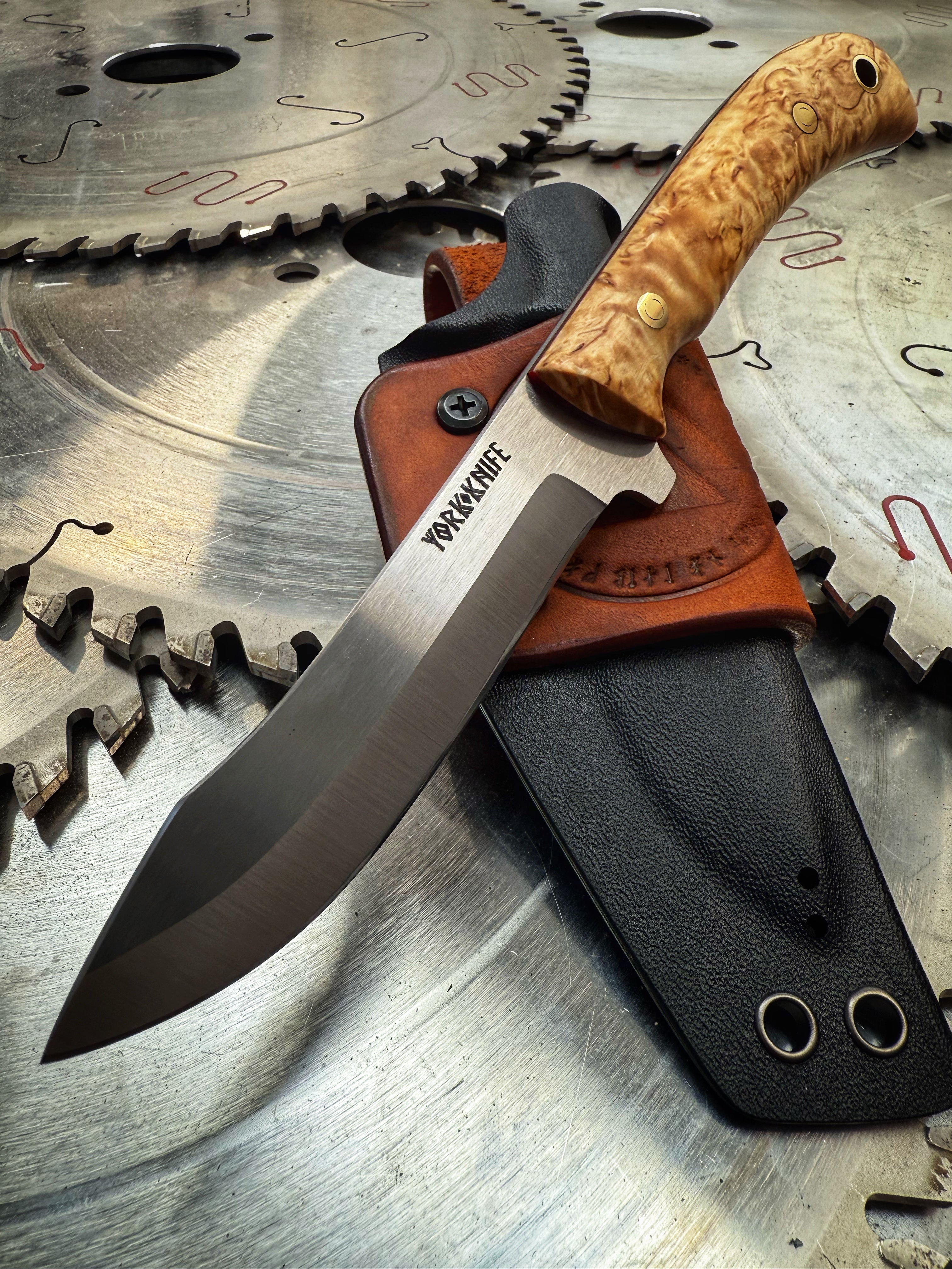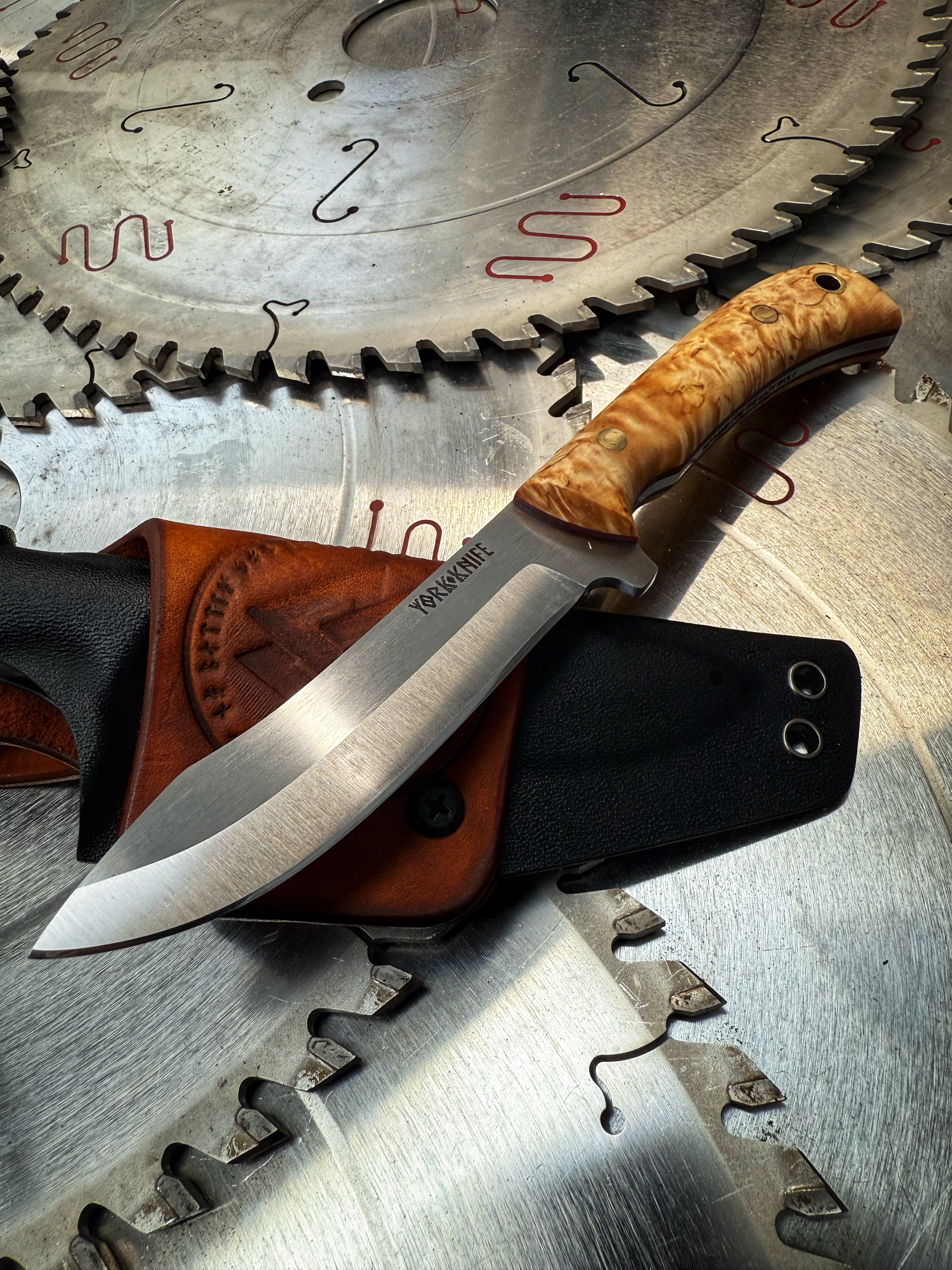 Weve fitted this Huntsman with a hardwearing piece of stabilised Masur Birch and added dark red G10 liners, held on with brass loveless bolts and of course marine grade epoxy. To complete the package we've created a right handed kydex and leather sheath that offers a positive sbappy fit to ensure the knife won't leave its sheath as you're dragging yourself through the woodlands, is easy to clean out when dirty and can be made even more slimline by removing the leather wrap and screwing on a normal belt clip