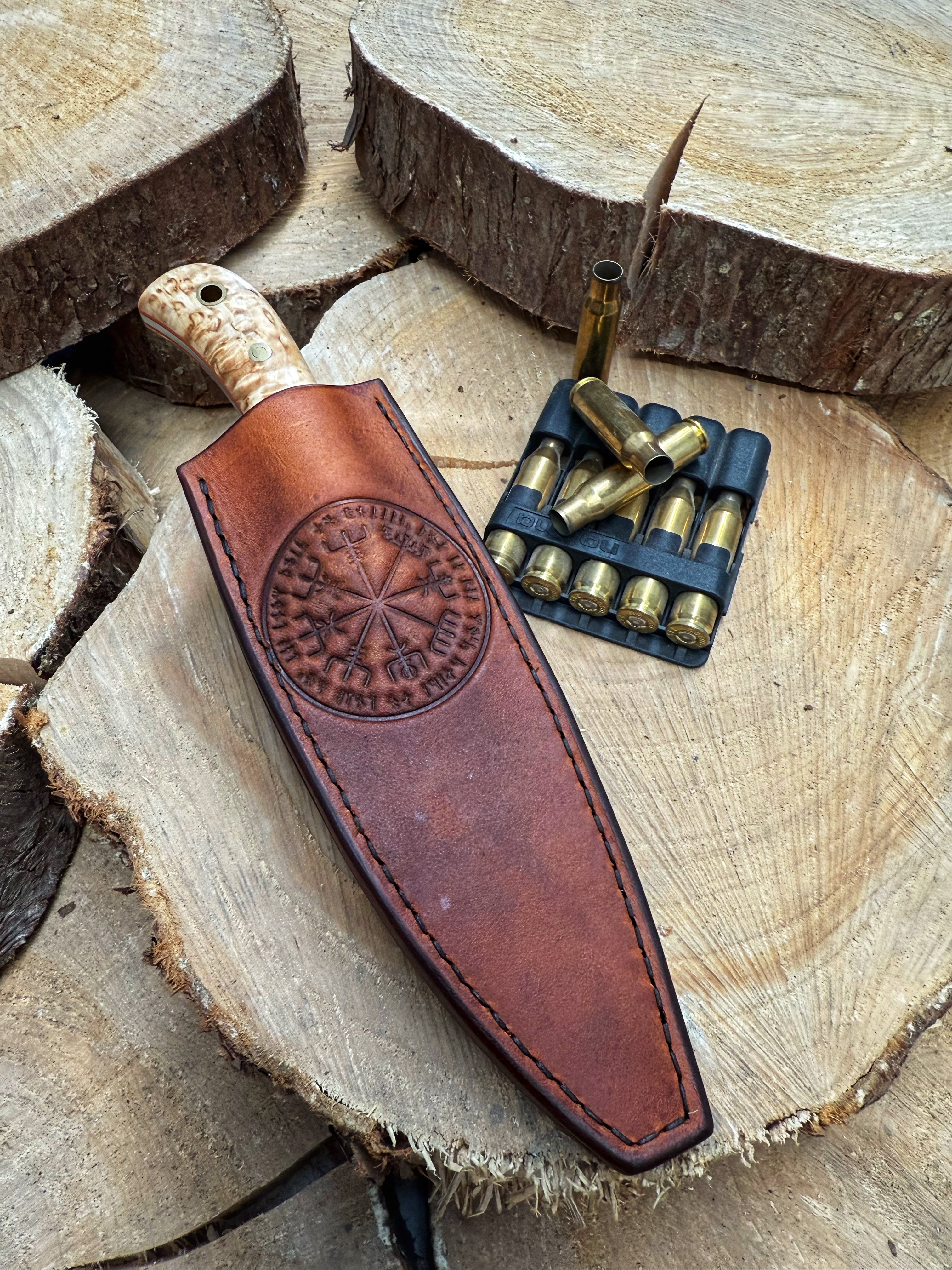 We've laser tattooed  the Norse Compass motif on the knife face and embossed the leather to match for a truly beautiful piece.