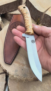 Weve fitted this Huntsman with a hardweaeing piece of stabilised Masur Birch and added orange G10 liners, held on with brass loveless bolts and of course marine grade epoxy. To complete the package we've created a right handed leather sheath that offers a positive firm fit to ensure the knife won't leave its sheath as you're dragging yourself through the woodlands